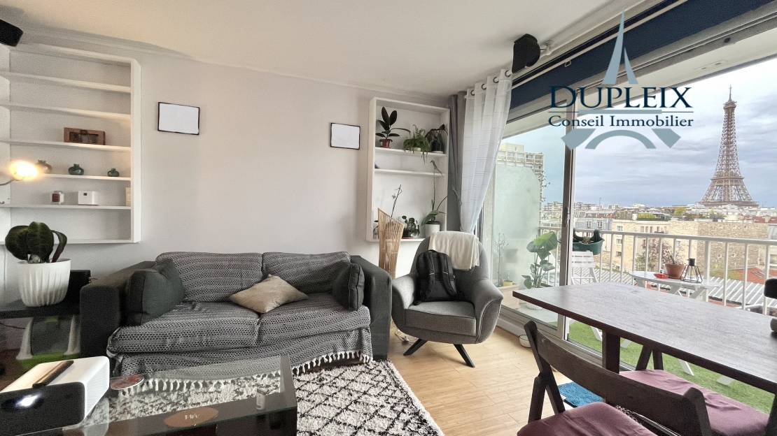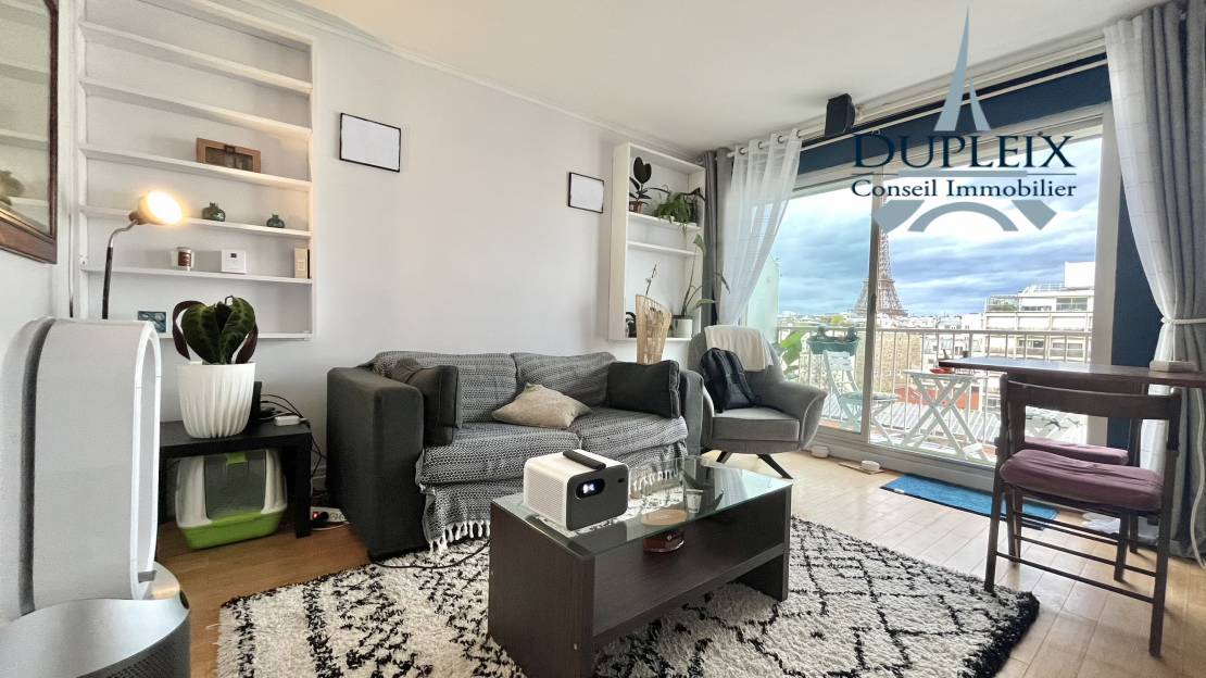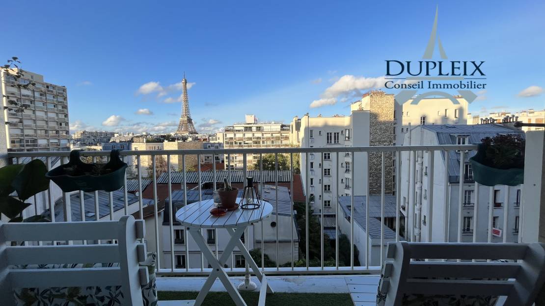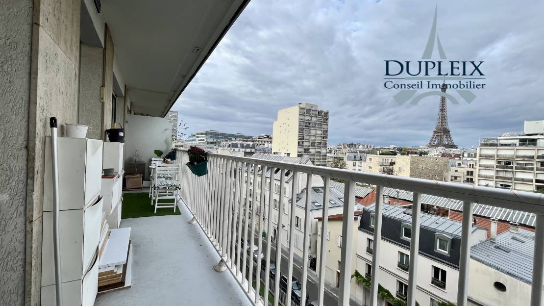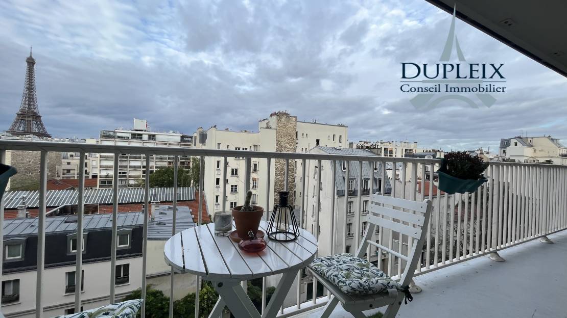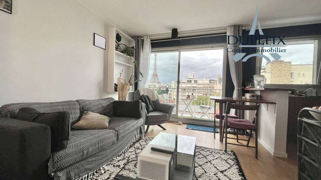Descriptif: L'AGENCE DUPLEIX vous un très joli 2 Pièces situé dans un immeuble récent d'excellent standing. Au 6ème étage avec ascenseur, l'appartement se compose d'une entrée, un séjour ouvrant sur un balcon de 9m2 offrant une vue imprenable sur la Tour Eiffel, une cuisine américiane, un dégagement avec placards, une chambre ainsi q'une salle de bains avec wc.