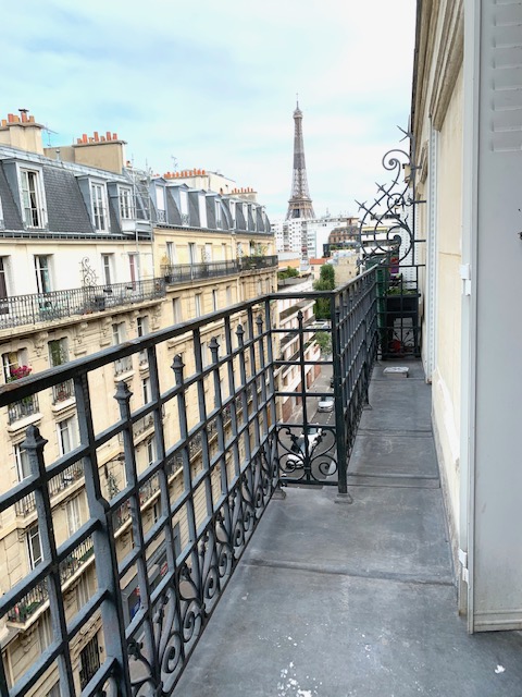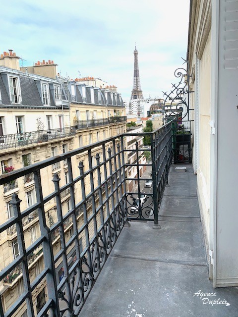 Appartement de 2 pièces au 5ème étage dans un bel immeuble en pierre de taille avec ascenseur comprenant un séjour, une chambre avec rangements ouvrant sur un balcon avec vue sur Tour Eiffel, une cuisine aménagée et équipée de plaques de cuisson, four, réfrigérateur, lave vaisselle et lave linge, une salle de douche, WC séparés . Parquet, charme de l'ancien.