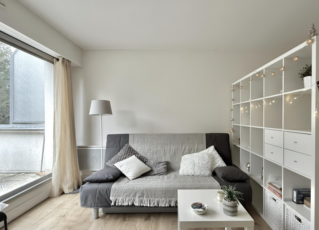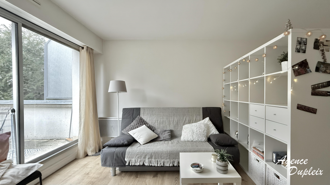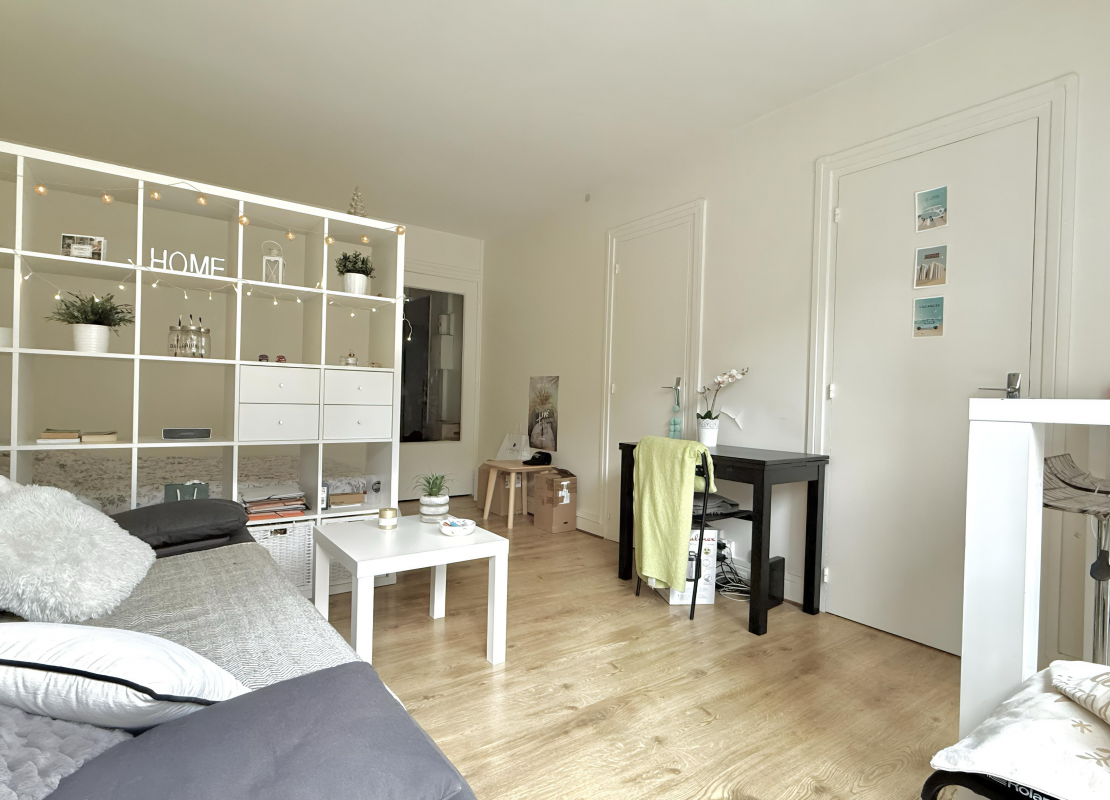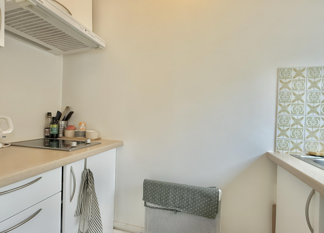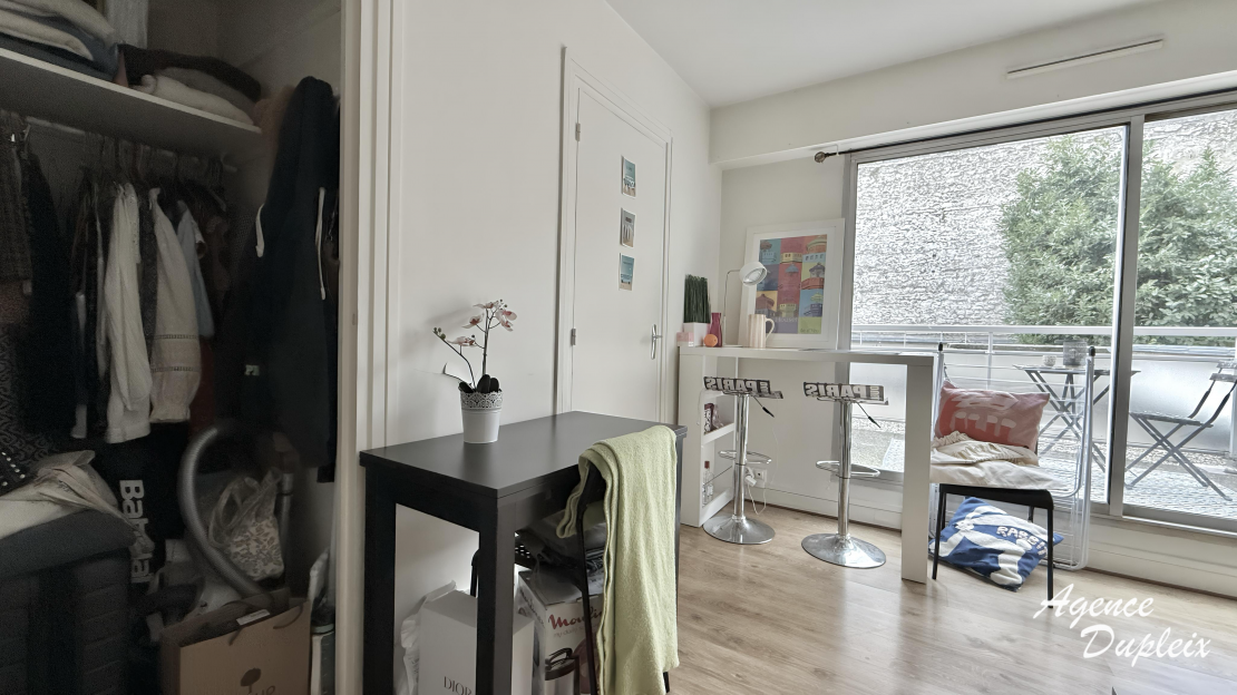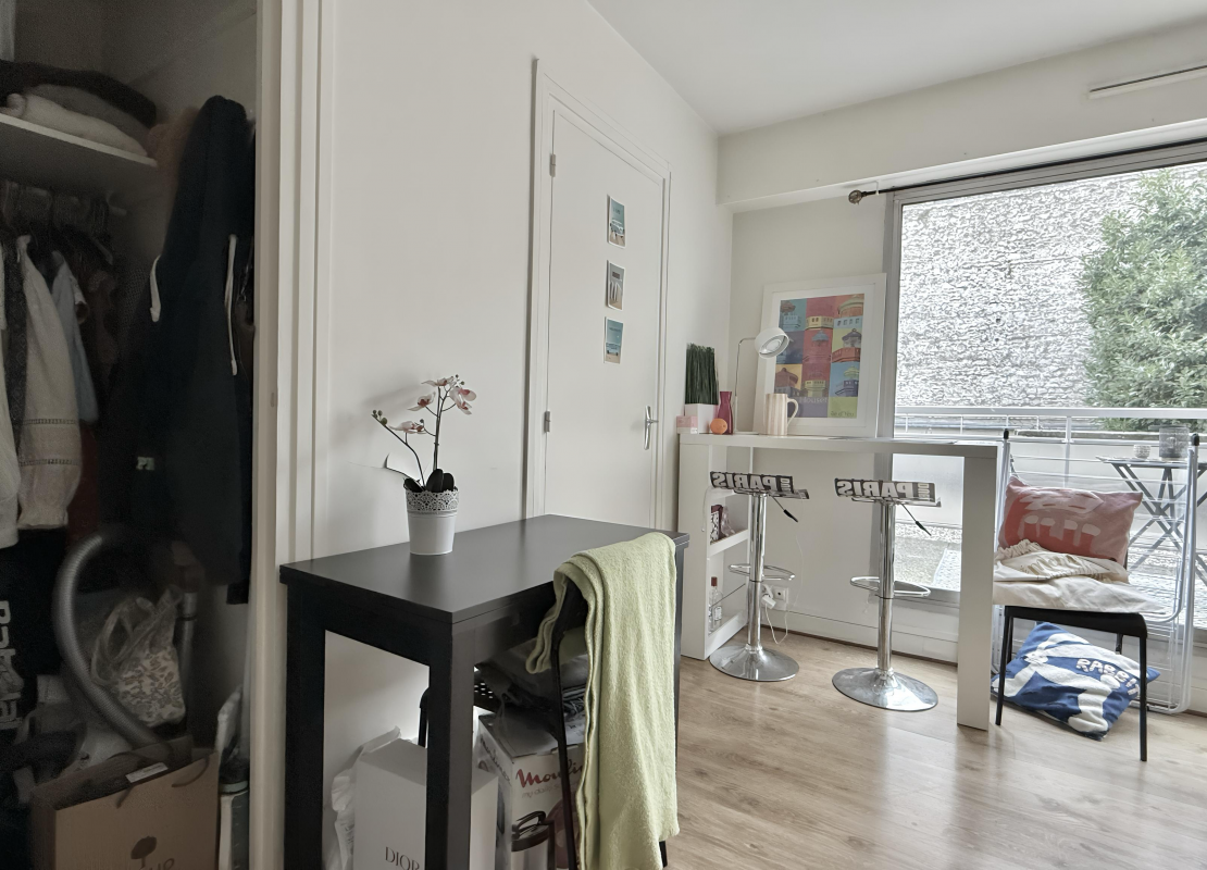 Un grand studio au 1er étage avec ascenseur se composant d'une entrée, une pièce principale avec un dressing et une terrasse, une cuisine séparée aménagée et équipée de plaques de cuisson, d'un four, d'une hotte et d'un réfrigérateur, une salle de bains avec WC et un lave linge.