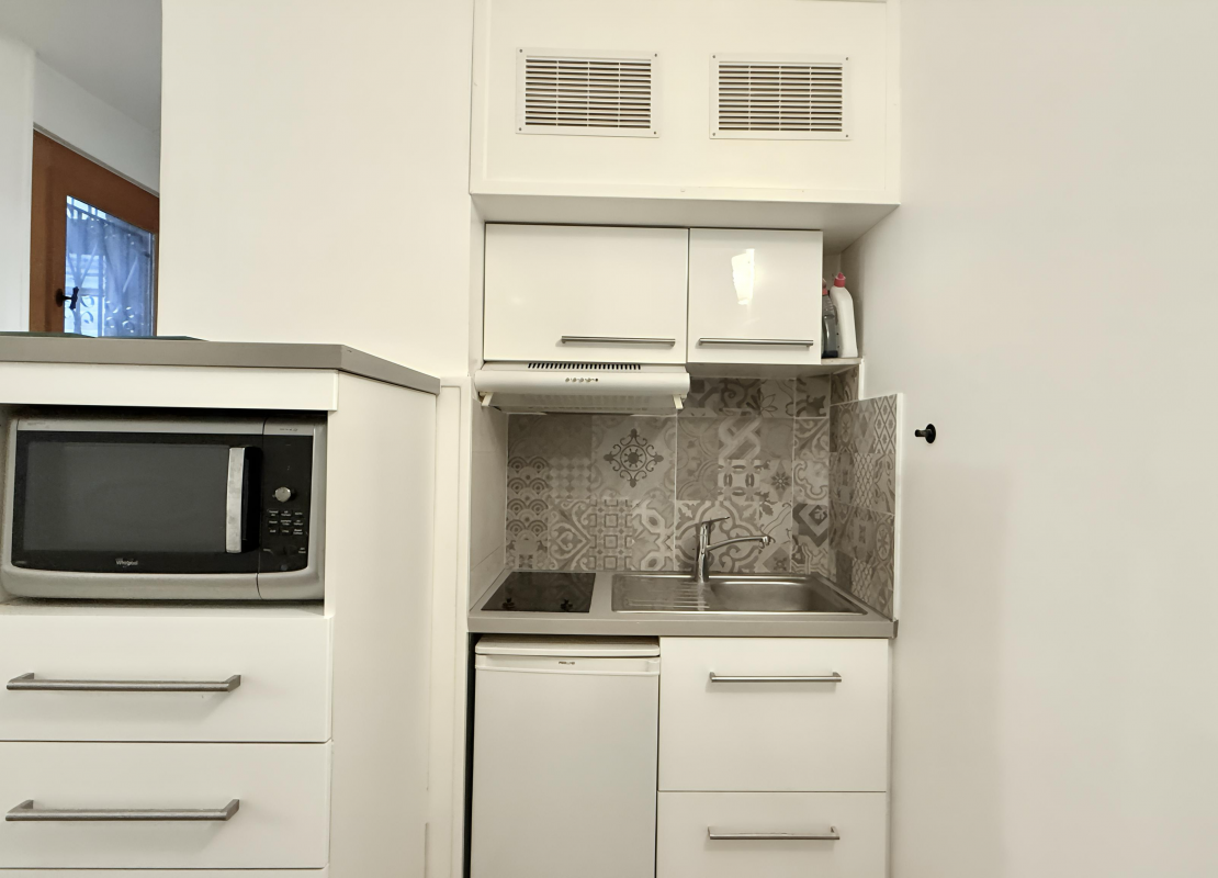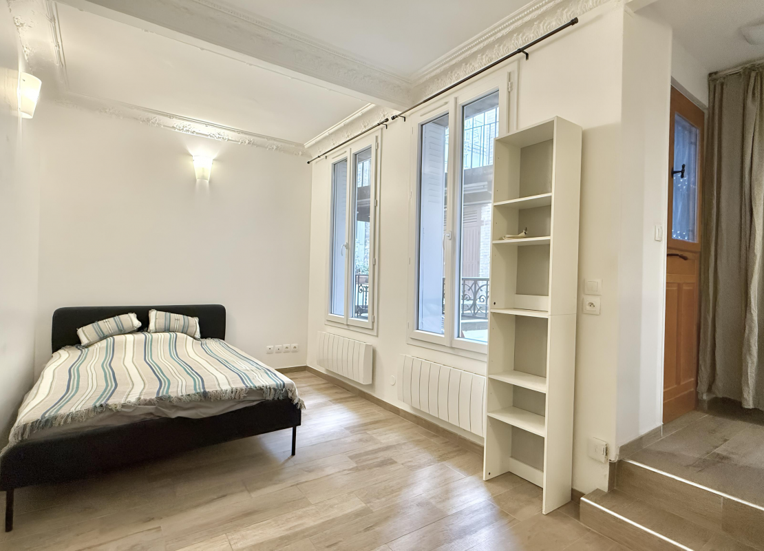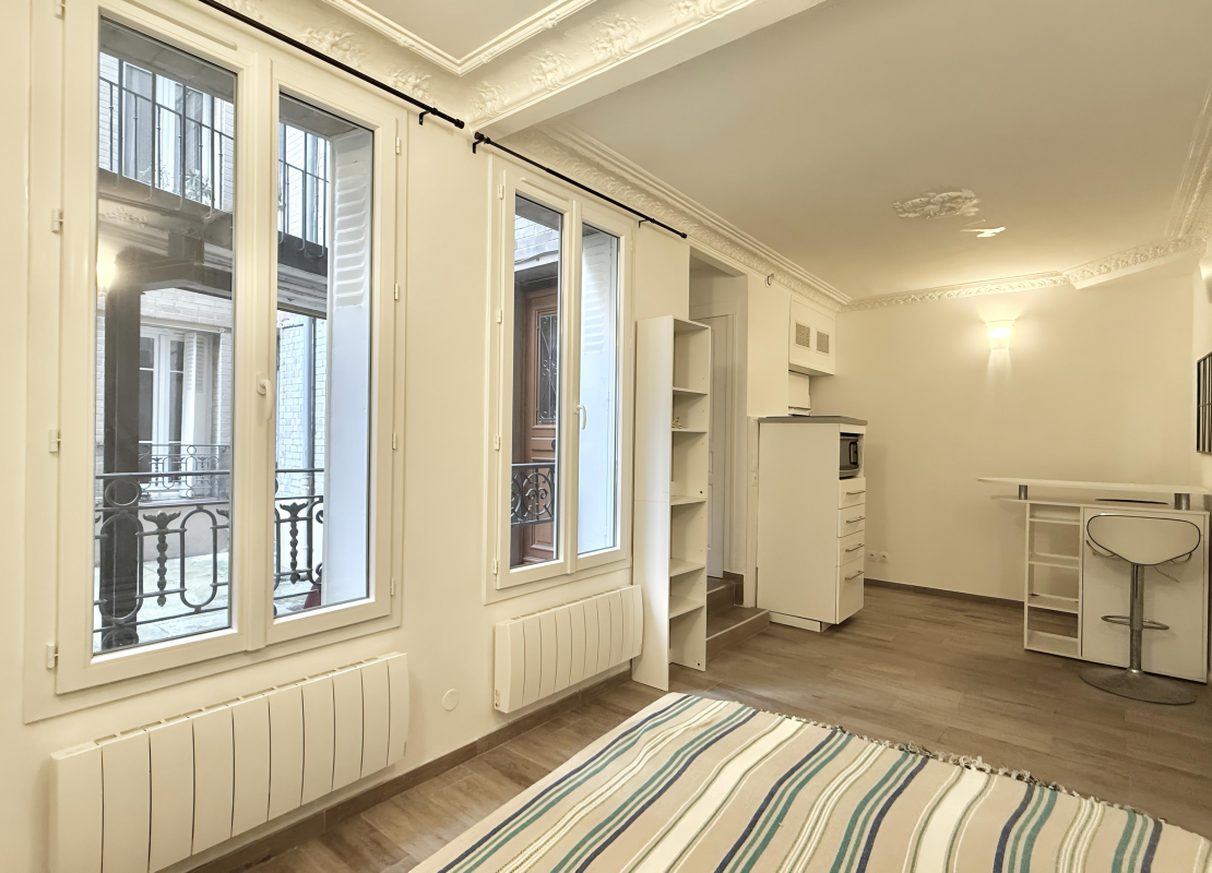 Situé au rez-de-chaussée d’un immeuble ancien, donnant exclusivement sur une cour intérieure, au calme, cet appartement se compose d’une entrée, d’une grande pièce principale de 17 m² avec deux fenêtres, d’une cuisine ouverte, ainsi que d’une salle d’eau avec WC.